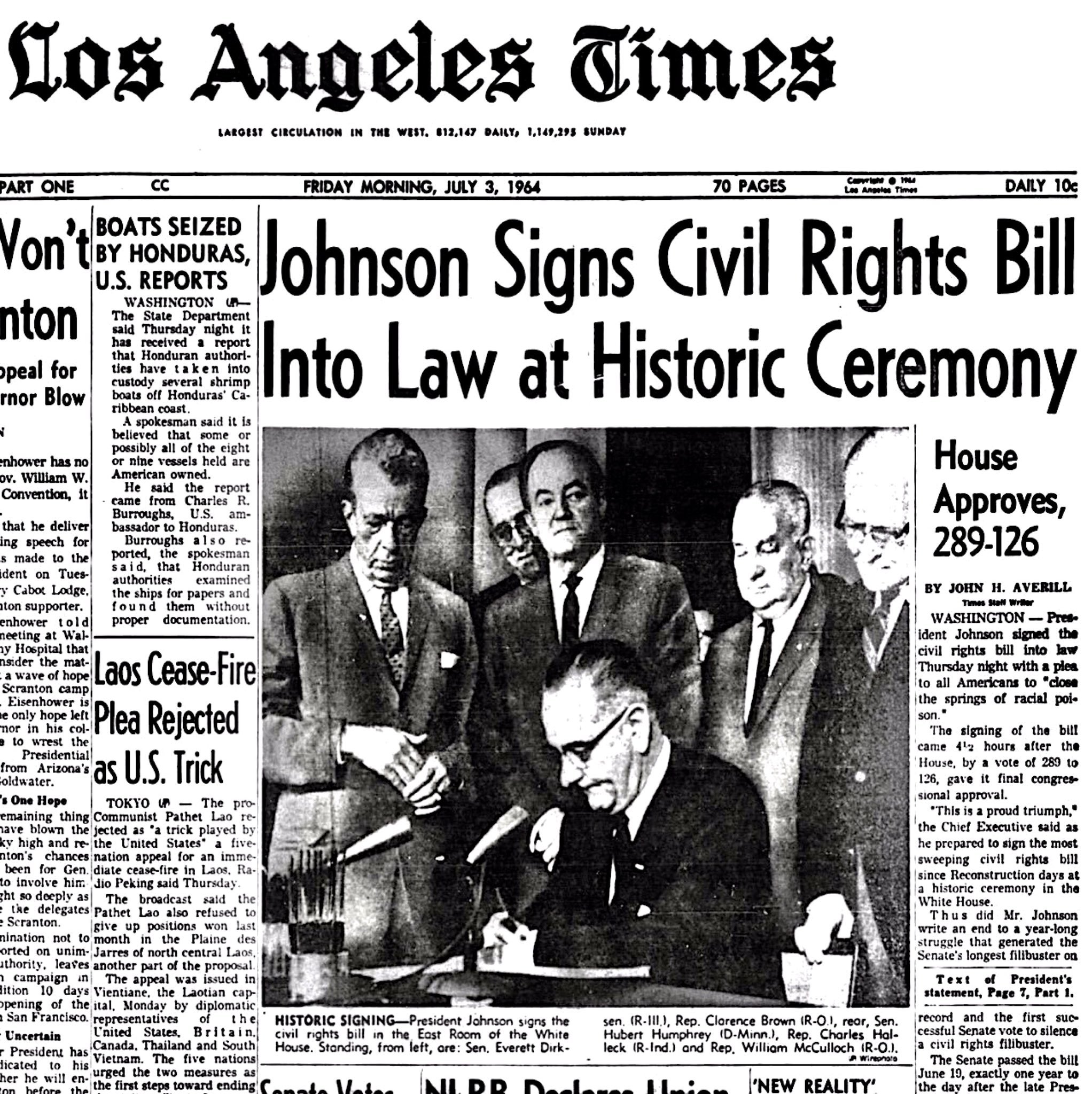 Newspaper Civil Rights Act Of 1964 : 50th Anniversary Passage Of The Civil Rights Act Of 1964 Citizen Newspaper Group Inc Premier African American Weekly - (originally published by the daily news on june 20, 1964.. The act outlawed discrimination on the basis of race, color, religion, sex, or national origin, required equal access to public places and employment, and enforced desegregation of schools and the right to vote. The civil rights act of 1991, p.l. The unfinished business of the civil rights act of 1964. Prices are hidden on the packing slip. The voting rights act of 1965;